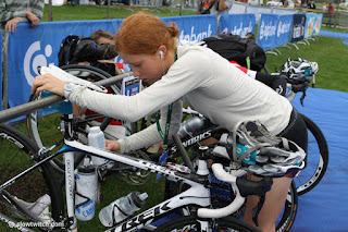 Final adjustments for Paula Findlay at 2010 Dextro Energy ITU World Championship Grand Finals at Budapest. #1: Focus. Listening her own music and ignore all odds. #2: See what she is holding, the baby powder. It is a must for my every race!